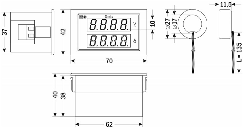 Щитовой цифровой индикатор тока и напряжения однофазный (вольтамперметр) Omix P74-AV2-1 предназначен для измерения и индикации напряжения и силы тока в однофазных сетях переменного тока