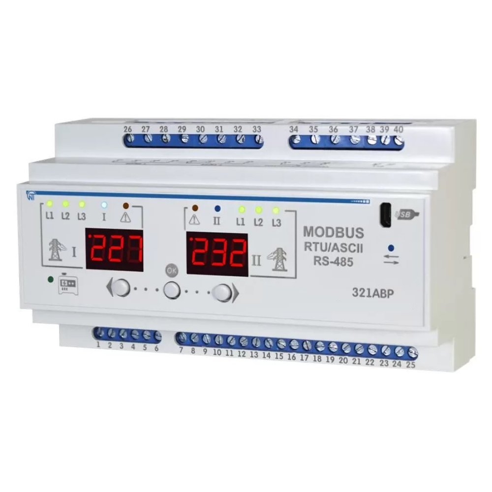 321АВР управляет автоматическим переходом с основного трехфазного источника питания на резервный и обратно при недопустимых отклонениях напряжения в фазах, асимметрии или перекосе фаз, изменении порядка чередования фаз, обрывах одной или нескольких фаз в «основной» или «резервной» сетях.