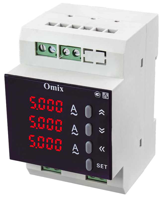 Амперметр трехфазный на DIN-рейку Omix D3-A3-3-K-N2 предназначен для измерения и индикации силы тока в трехфазных сетях переменного тока, а также для сигнализации о выходе измеренных значений за установленные пределы