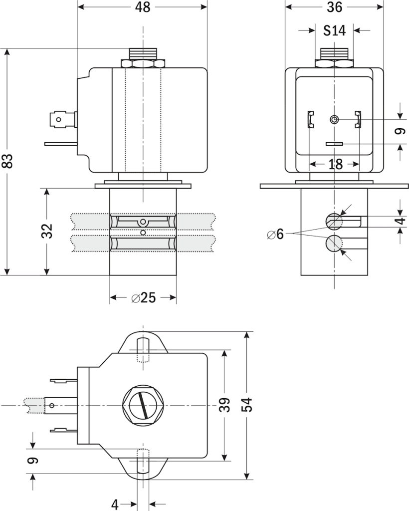Соленоидный клапан, пережимающий две трубки (верхняя нормально закрытая, нижняя нормально открытая) — это клапан, который при отсутствии напряжения на его индукционной катушке закрыт для потока рабочей среды через верхнюю трубку и открыт для потока рабочей среды через нижнюю. При подаче напряжения на катушку магнитный клапан этого типа пережимает нижнюю трубку и освобождает верхнюю и остается в таком положении все время, пока напряжение подается на катушку. При обрыве провода управляющего напряжения верхняя трубка закрыта, нижняя – открыта.