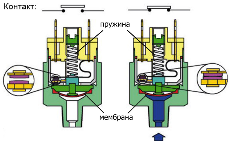При давлении среды ниже заданного контакты реле разомкнуты. При достижении установленного значения давления среда выгибает мембрану, контакты реле замыкаются. При снижении давления мембрана возвращается в исходное положение, и реле размыкается.