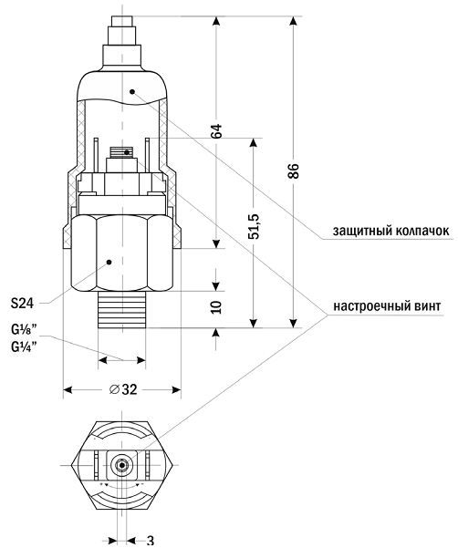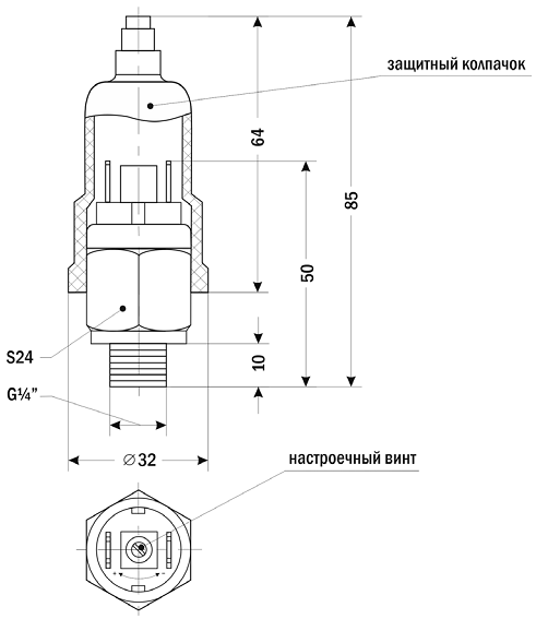 - Простой способ регулировки значения срабатывания с помощью шестигранного ключа или шлицевой отвертки