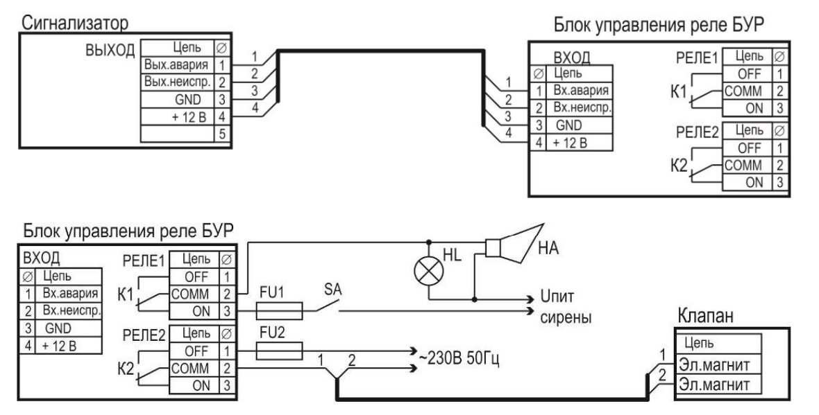 Блок способен управлять нормально закрытым клапаном типа КПЭГ с ручным взводом с рабочим напряжением ~230 В и потребляемым током не более 2 А.
