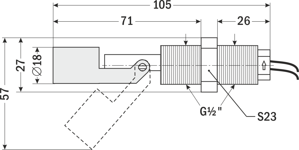 - В зависимости от способа установки датчика выходной контакт замыкается или размыкается при понижении уровня жидкости