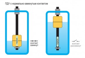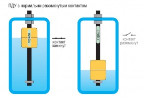 Рис. 2. Повышение уровня жидкости в резервуаре приводит к перемещению поплавка вверх и замыканию/размыканию контакта датчика уровня.