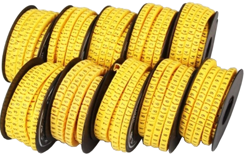 Маркировка кабельная на провод • Предназначены для проводов диаметром 2...5 мм • Цифры: 0...9 • Буквы: A, B, С, N • Материал: ПВХ • Количество в бобине: 1000 шт.