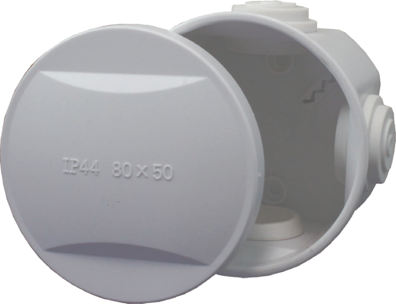 Распределительная коробка предназначена для использования с гофрированными, гладкими или армированными трубами в силовых или слаботочных сетях • Количество входов: 4 • Материал корпуса: полипропилен • Конструкция: круглая с крышкой • Крепление крышки: на защелках • Крепление коробки: винтовое на поверхность • Степень защиты: IP44 • Габаритные размеры: ∅ 87×56 мм