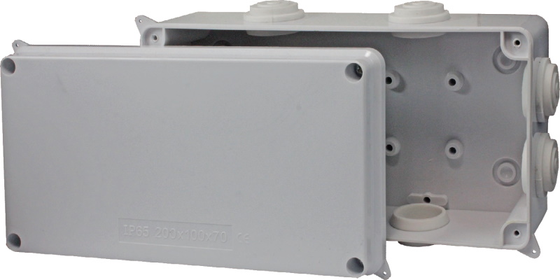 Распределительная коробка предназначена для использования с гофрированными, гладкими или армированными трубами в силовых или слаботочных сетях • Количество входов: 8 • Материал корпуса: полипропилен • Конструкция: прямоугольная с крышкой • Крепление крышки: винтовое М4×1,5 • Крепление коробки: винтовое на поверхность • Степень защиты: IP65 • Габаритные размеры: 208×108×70 мм