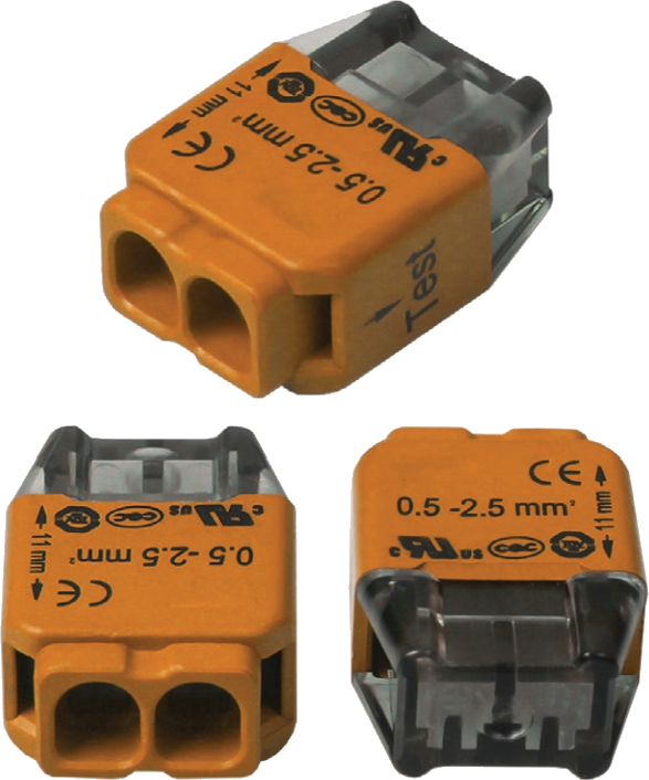 Клемма соединительная для быстрого и безопасного соединения проводов сечением 0,5...2,5 мм^2 • Количество контактов: 2 • Сечение провода: 0,5...2,5 мм^2 • Номинальное напряжение: 300 В • Номинальный ток: 24 А • Цвет: оранжевый • Способ подключения проводов: пружинный зажим