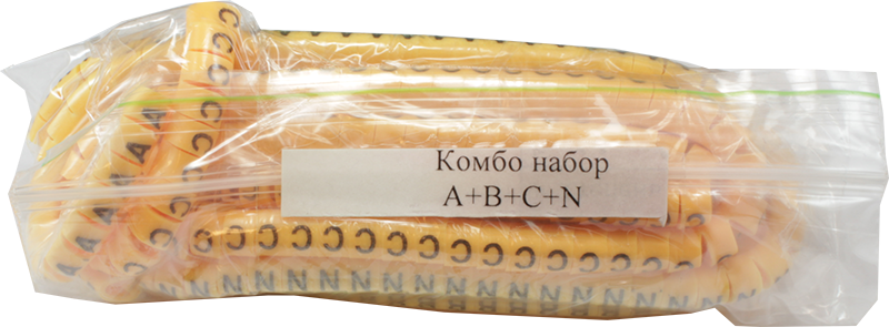 Набор маркировки кабельной на провод • Предназначены для проводов диаметром 2...5 мм • Набор букв: A+B+C+N • Материал: ПВХ • Количество в упаковке: 400 шт. (по 100 штук для каждой буквы)