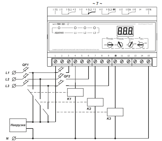 Реле выбора фаз ПЭФ 319 позволяет устанавливать приоритетную фазу, на которую будет переходить основная нагрузка. После стабилизации состояния энергосети устройство возвращается в исходное положение. Текущее напряжение по каждой фазе можно увидеть на индикаторе. Если нагрузка в первой фазе выходит за установленные пороговые значения, ПЭФ-319 переключается на следующую. При желании можно настроить временную задержку в переключении от одной линии к другой.