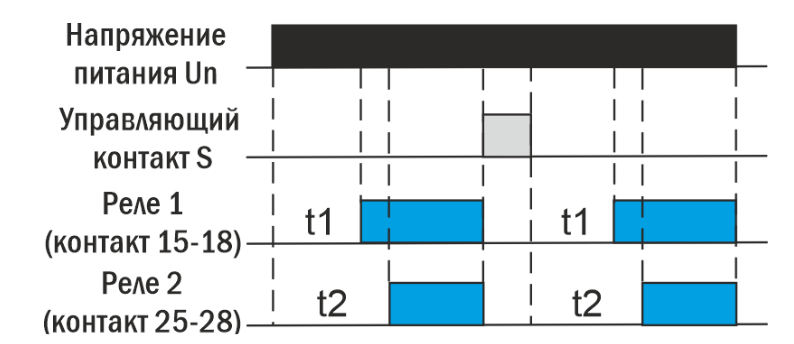 При подаче питания прибор начинает отсчет времени t1 и t2, по окончании интервала t1 срабатывает выходное реле 1 (замыкается контакт 15-18), по окончании интервала t2 срабатывает выходное реле 2 (замыкается контакт 25-28). При снятии питания либо замыкании управляющего контакта S оба реле возвращаются в исходное состояние. Перезапуск может