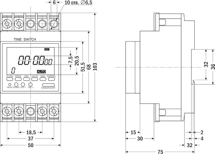 - Возможность ручного переключения контактов реле кнопкой на лицевой панели