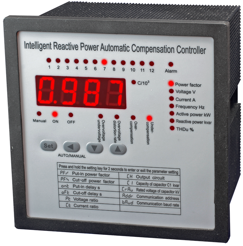 Регулятор измеряет коэффициент мощности сети и управляет включением косинусных конденсаторов для удержания оптимального коэффициента мощности.