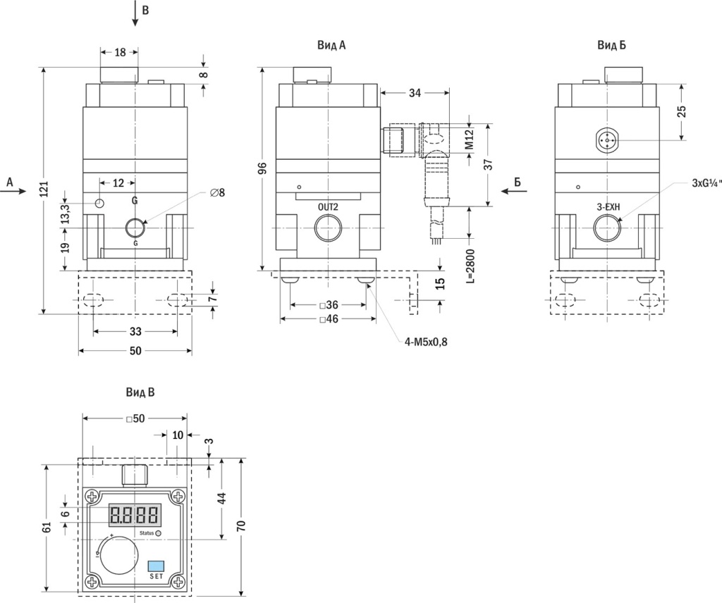 Силовая пневмомеханическая часть регулятора имеет три пронумерованных на корпусе отверстия (порта): 1 – подача сжатого воздуха, 2 – канал выхода воздуха в полость с регулируемым давлением, 3 – канал сброса избытка воздуха из регулируемой полости в атмосферу.